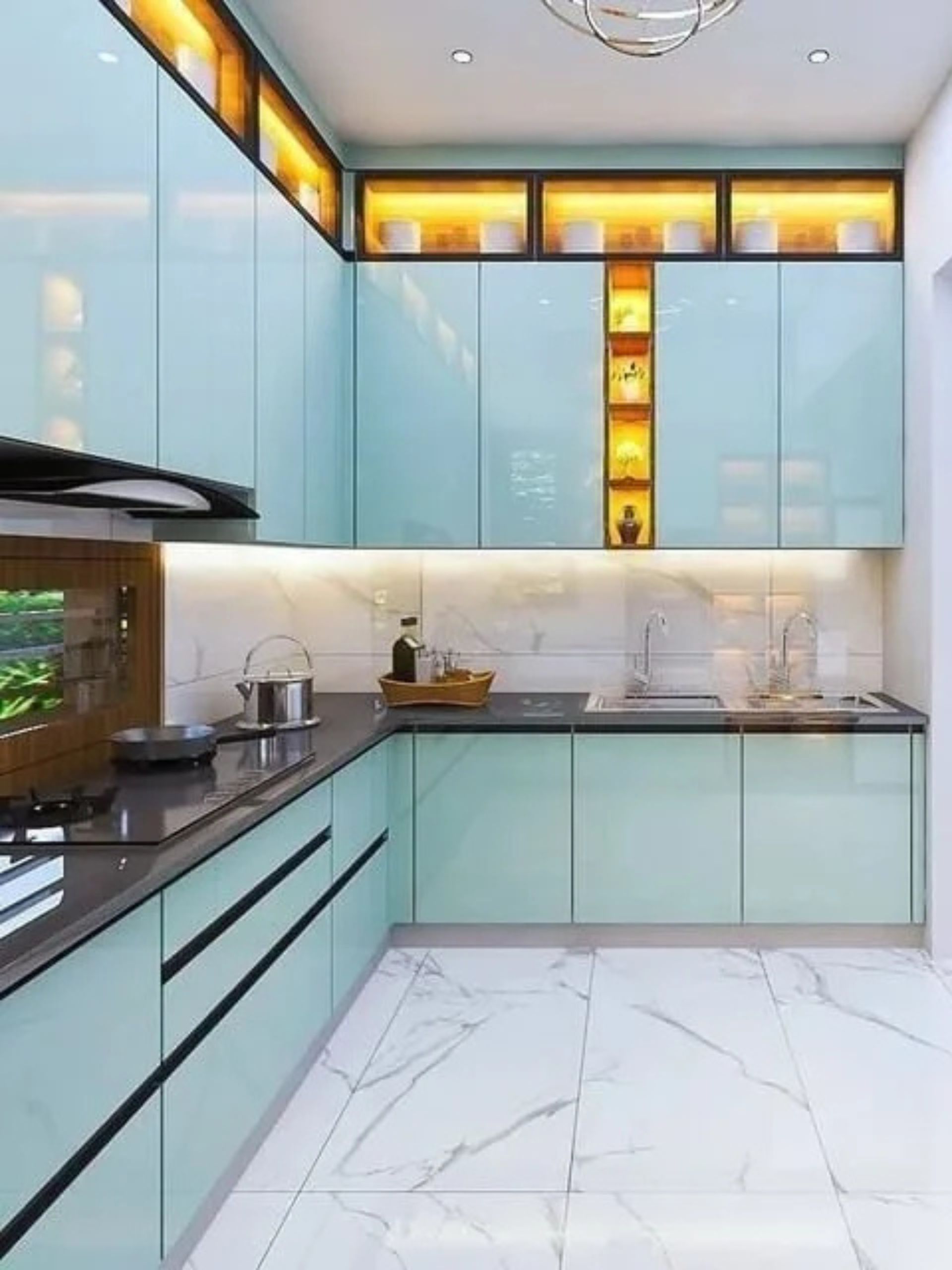 Modular kitchens are typically built using marine plywood, MDF, laminates, acrylic finishes, and premium hardware accessories for durability and long life.